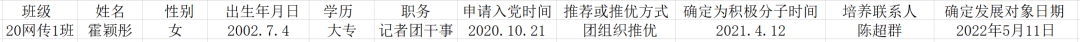 经党支部考察,下列同志将于近期召开发展对象通表会,拟接收为中共预备党员。为保证发展党员质量,增强工作透明度,现将1位同志的有关情况公示如下: