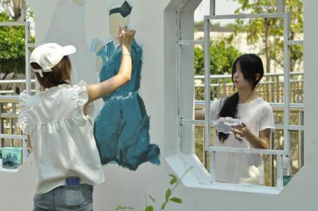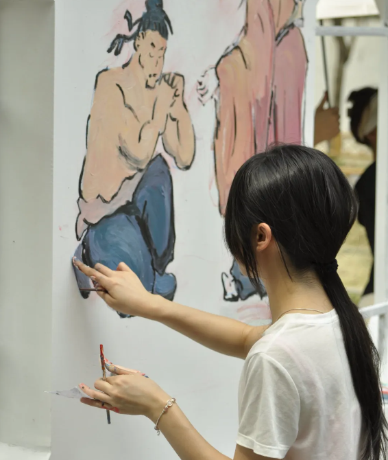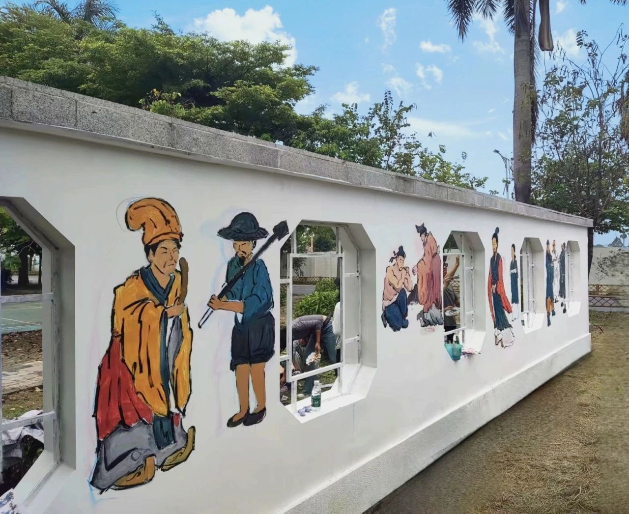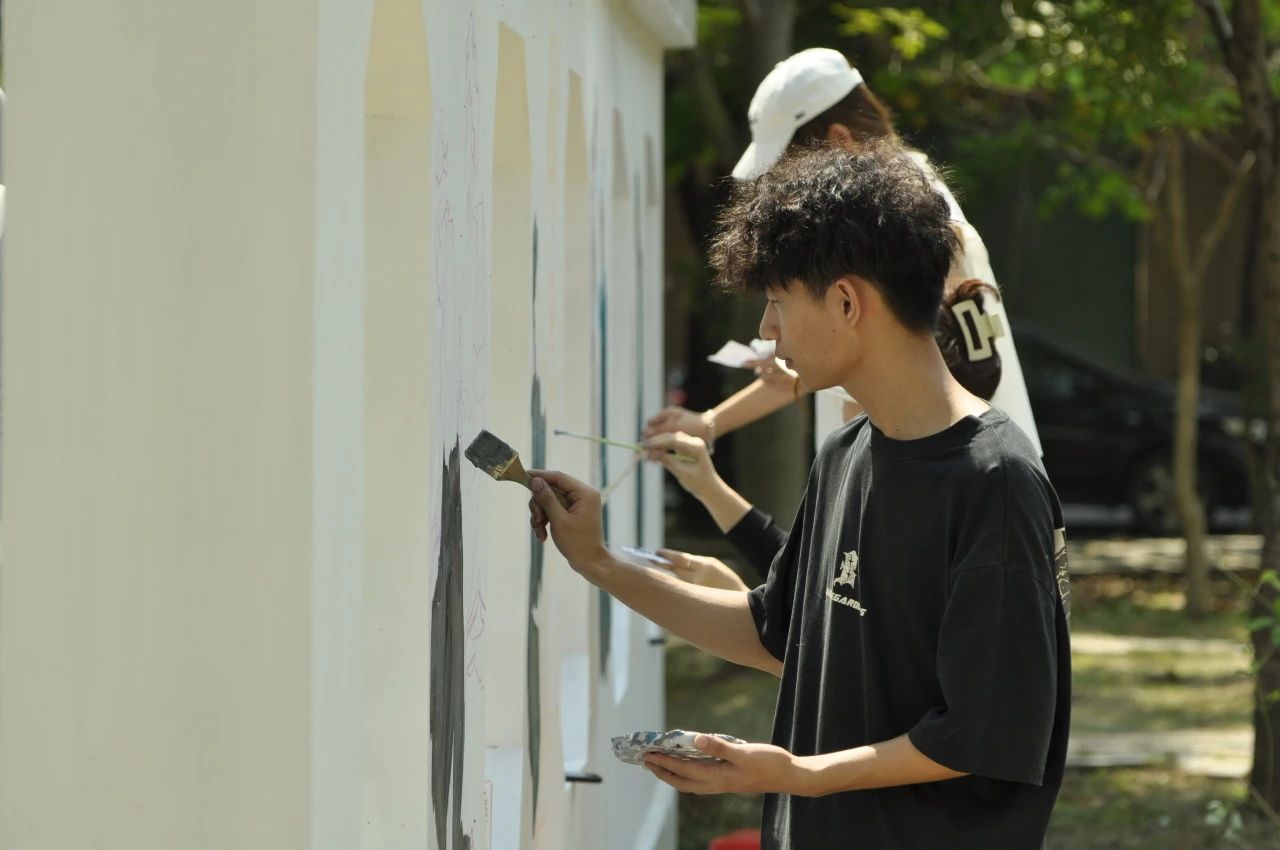 在炽热的烈日下,实践团成员们展先出坚韧不拔的精神风貌。他们齐心协力、紧密合作,有的人准备画具与调色,有的人全神贯注于画面设计,还有的人负责线条勾勒与上色工作。大家分工明确、相互配合,依据墙面的特性和主题设定,精细且专注地开展壁画艺术创作。