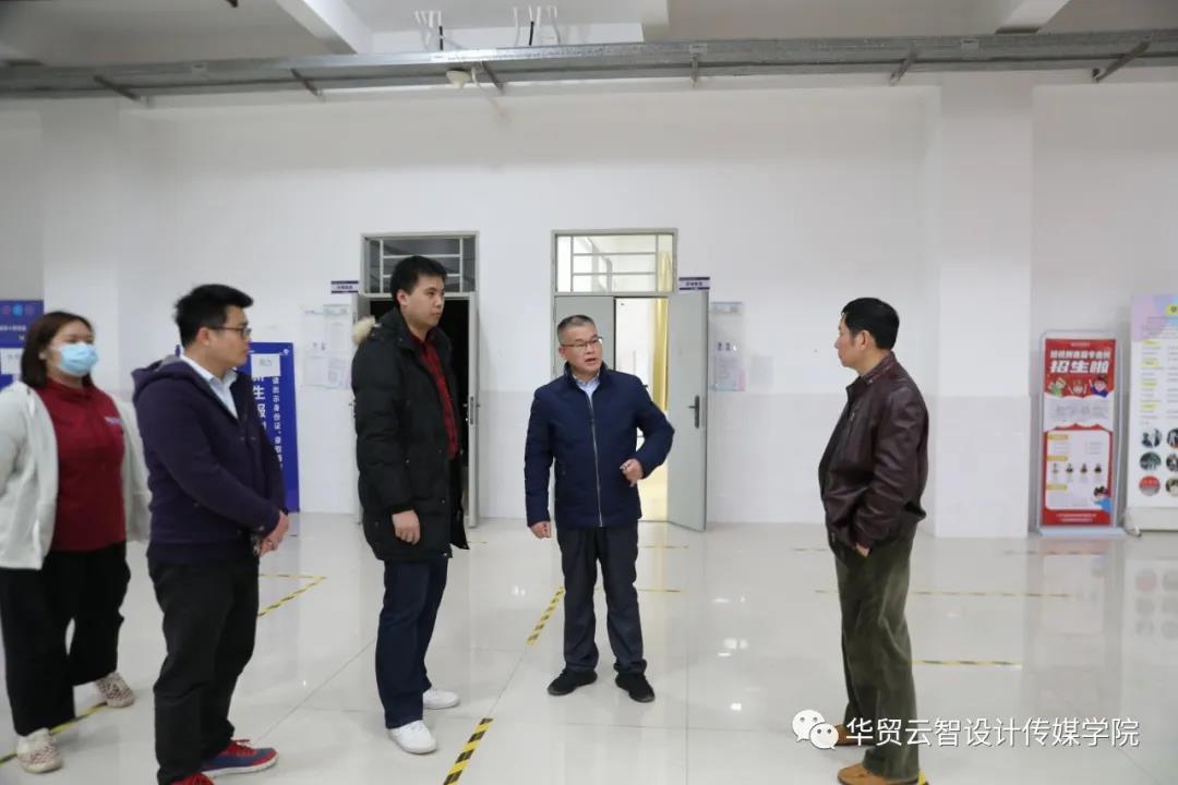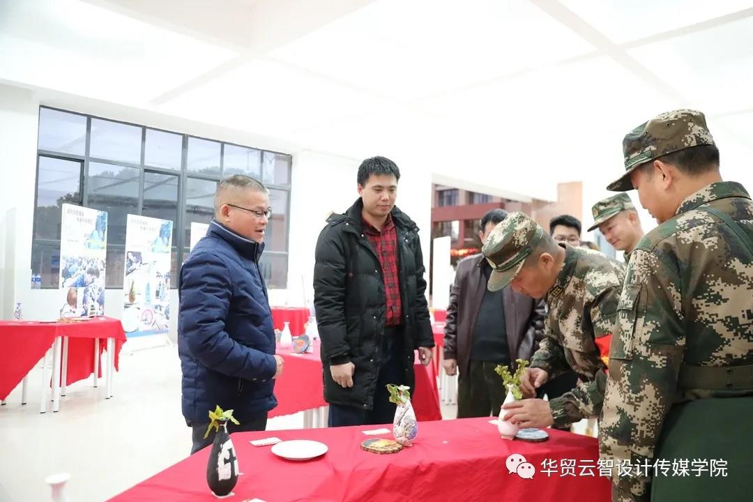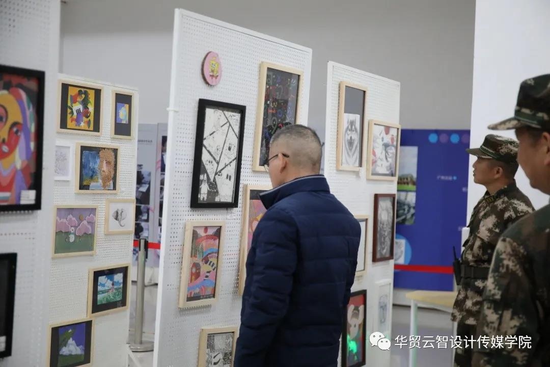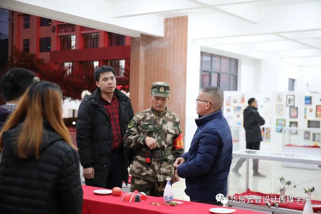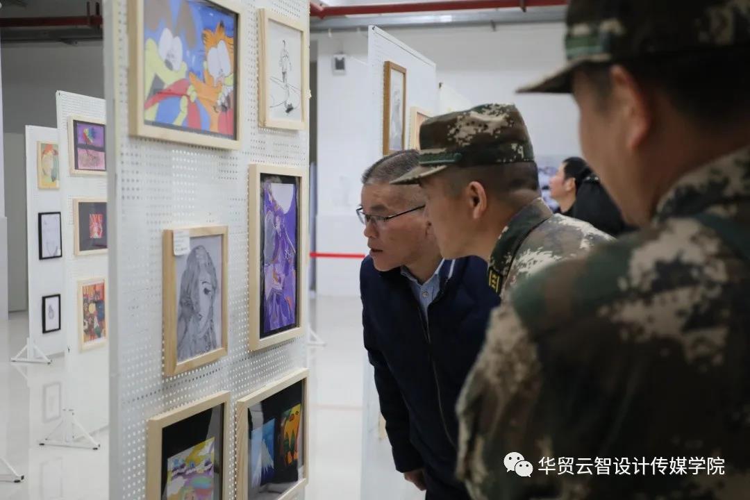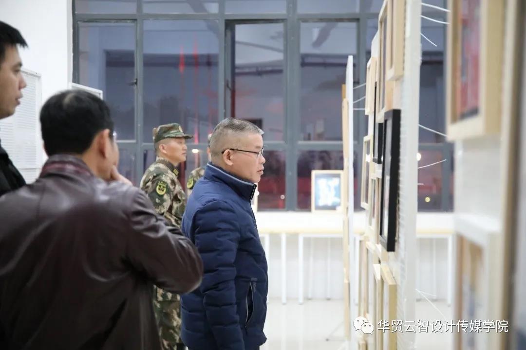 12月22日下午,刘剑清校长、王书汉书记和广东武警某支队领导在百忙之中前往1号教学楼大厅共同参观了2020年传媒学院学生优秀作品展。