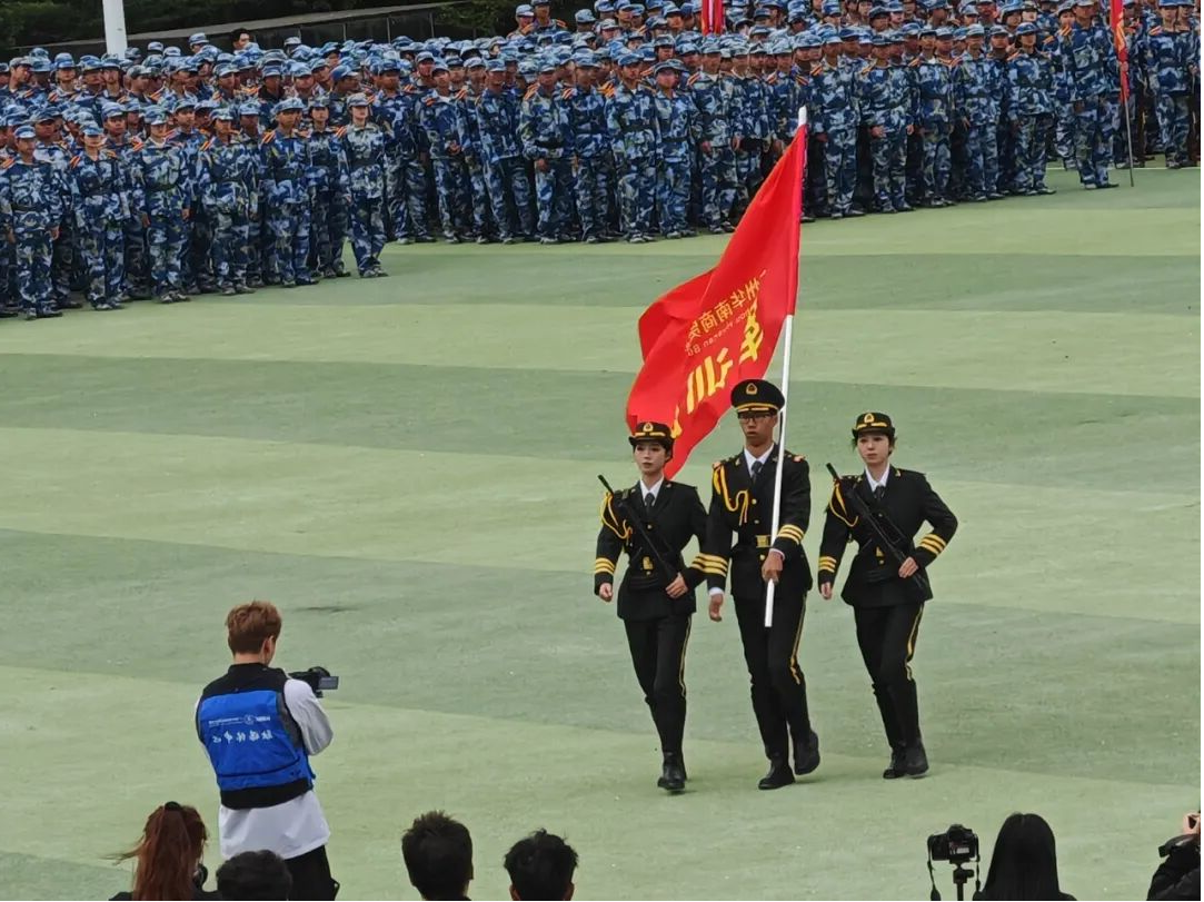 随后,军训团团旗在护旗手的护卫下迎风入场。新生们目光坚定、神情肃穆,展现出强烈的使命感与集体荣誉感。